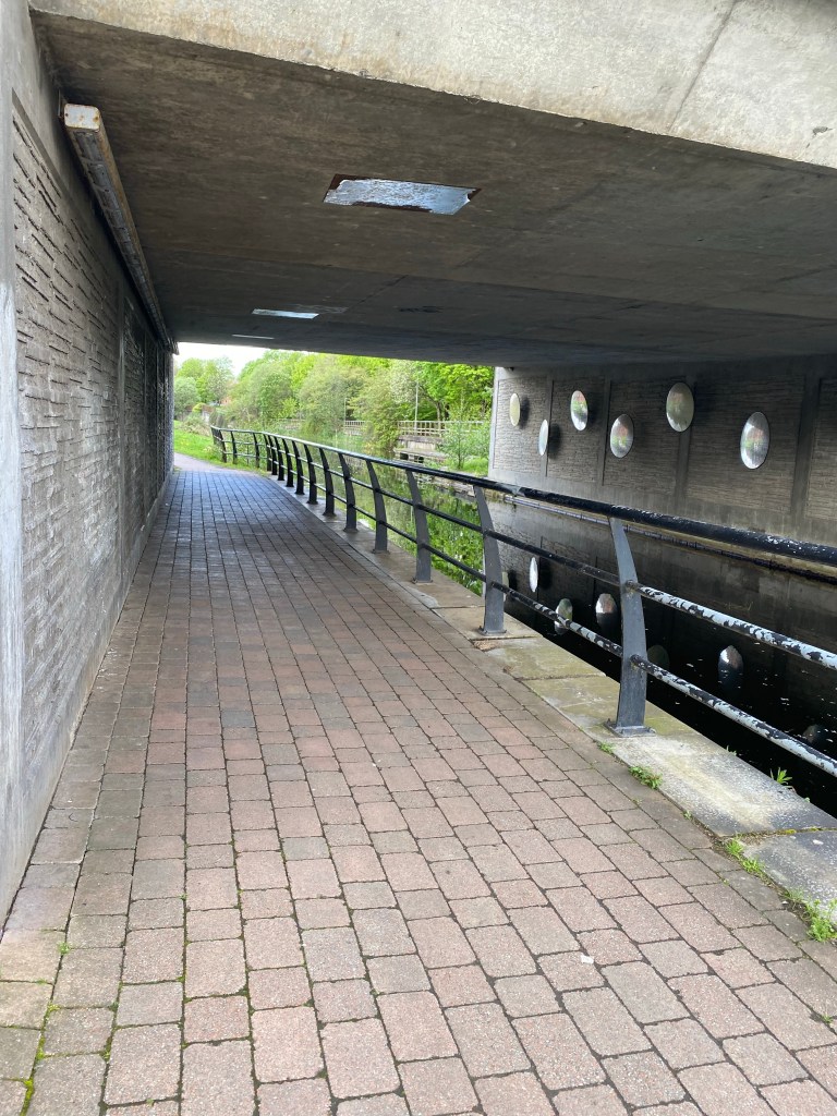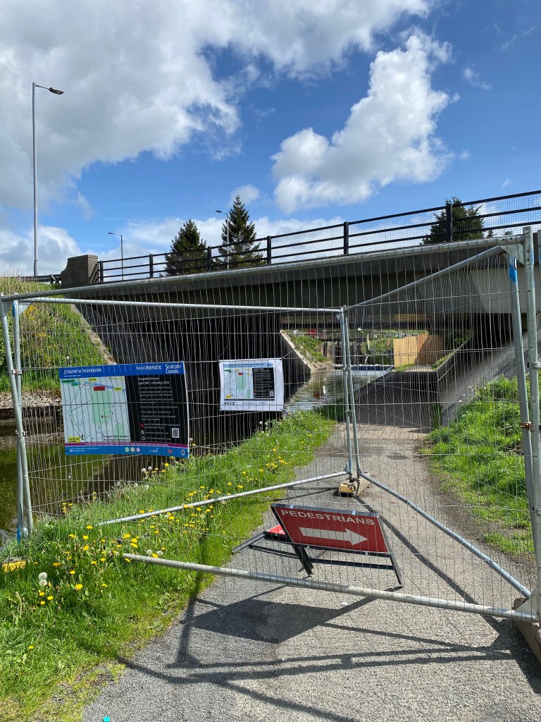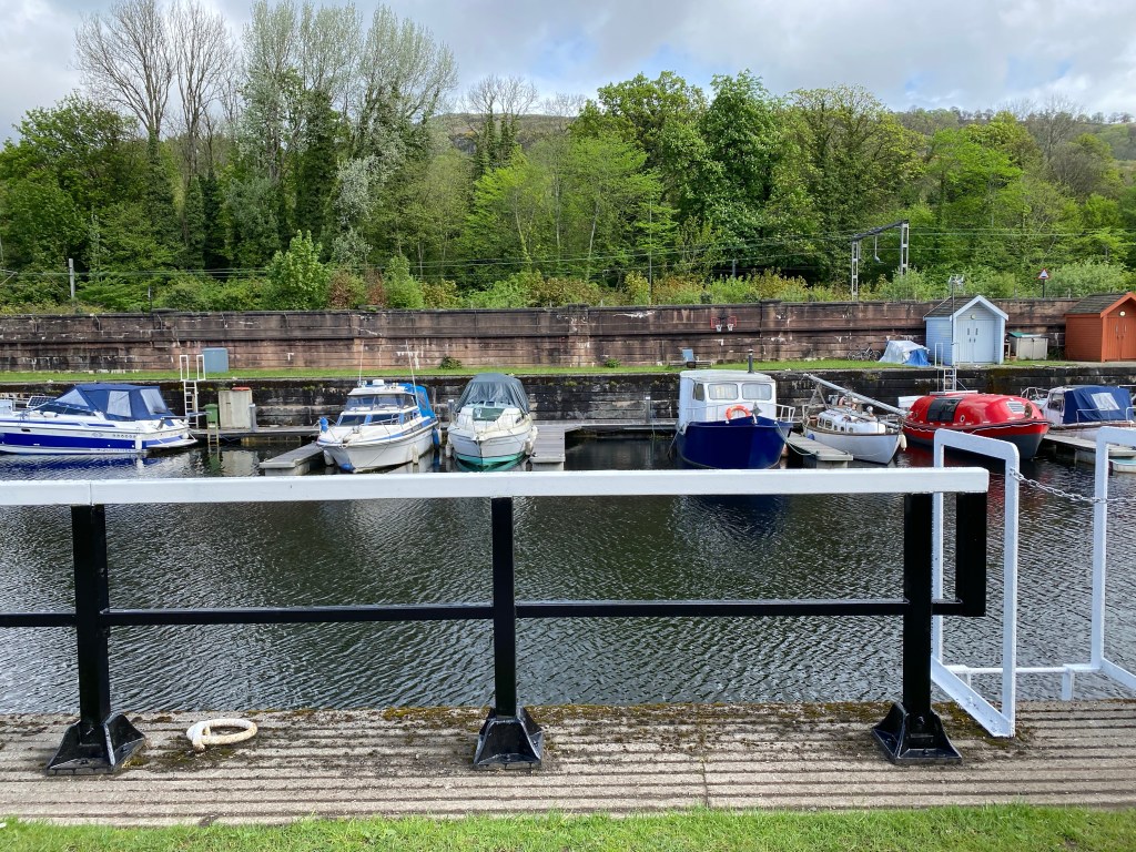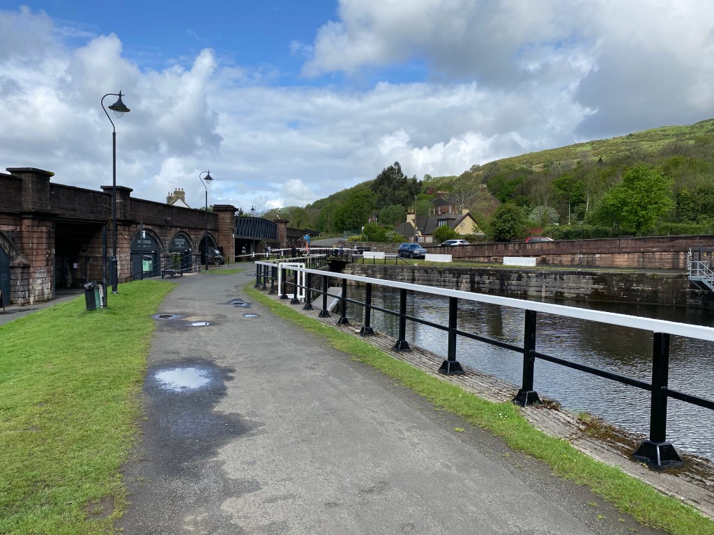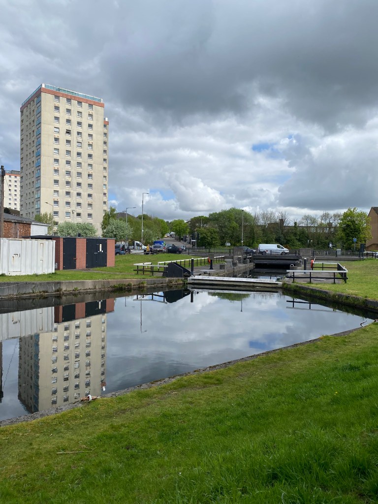 My initial thoughts on Bowling was a bit shaky, but it went from derelict to superb in no time flat. Weather started out great for hiking but I was keeping an eye on those clouds. The canal path was wide and paved which helped me make great time into Clydebank. Time for tea and a pee and then start heading slightly north on the canal to Glasgow.